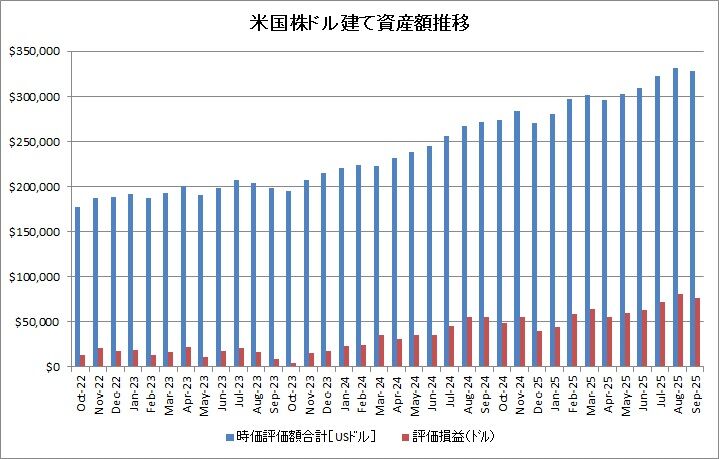 米国株式のみのドルベースでの状況では、時価評価額が328,422.97ドル(同1.0%減)、評価損益は+76,172.96ドル(同5.4%減)でした。