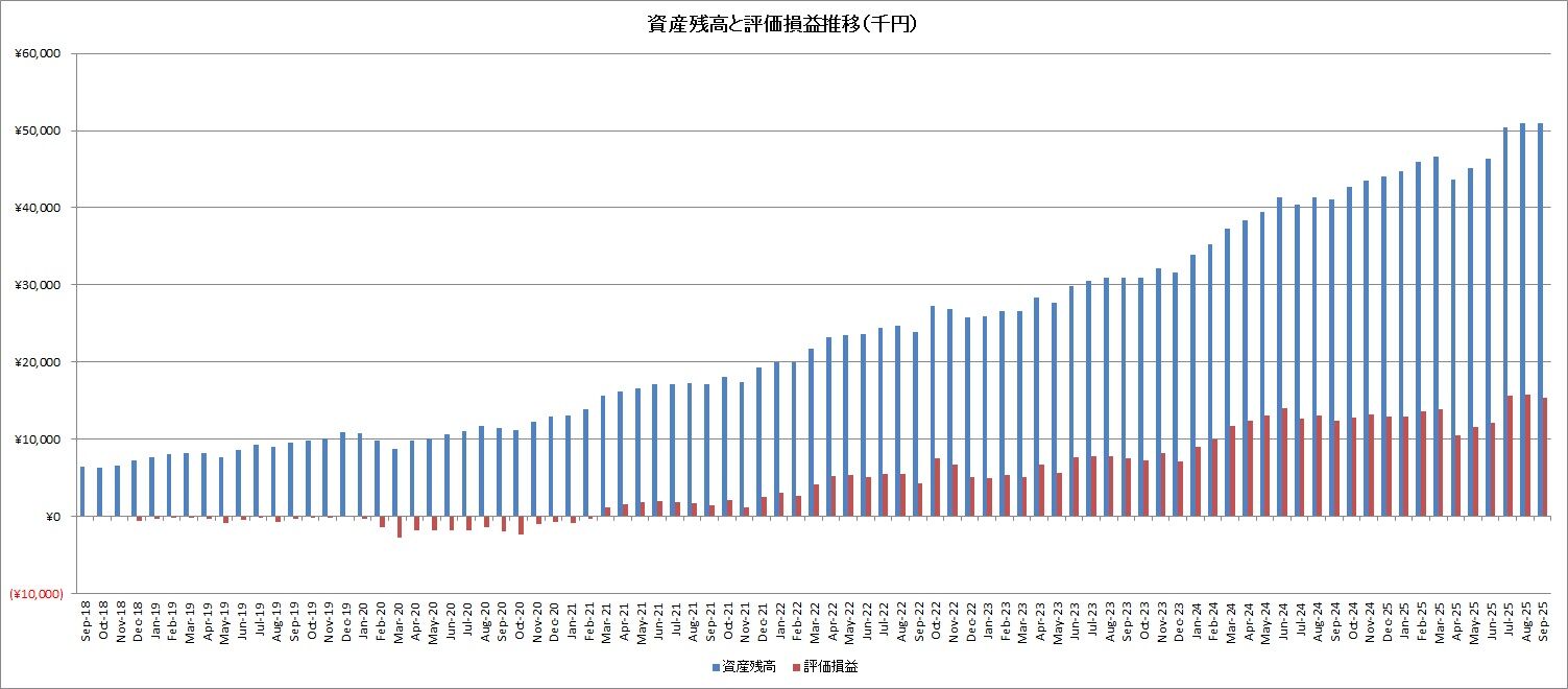 こちらは資産額と評価損益の長期間の推移です。ひとまず資産額5,000万円超を3ヶ月間連続で守ったので、それは良かったかな。