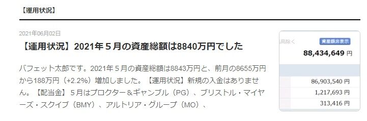 最も直近で公開されていたのは、2021年5月でした。その時点の資産額は8840万円でした。