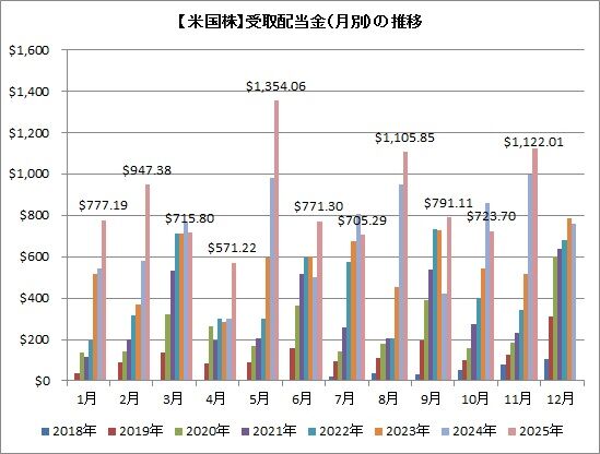 受取りの銘柄数は9月(9銘柄)や10月(7銘柄)よりも少ないですが、一銘柄あたりの受取額が大きくなったことで、単月で1,000ドル超えとなりました。