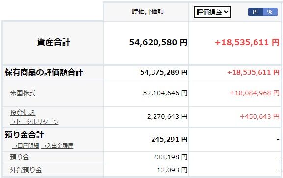 評価損益は合計で+18,535,611円(同+14.9%)となっていて、米国株式で+18,095,968円(同+8.9%)、投資信託で450,643円(同+14.8%)となりました。