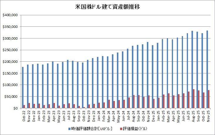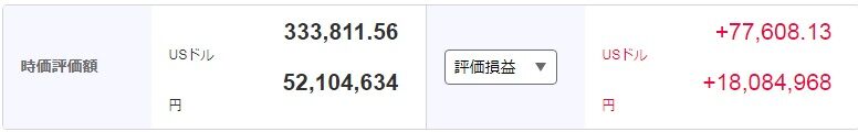 続いてドルベースです。米国株式のみの値となりますが、時価評価額は333,811.56ドル(同+3.9%)、評価損益は+77,608.13ドル(同+16.0%)でした。
