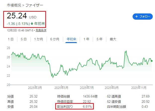 最後にファイザーの株価と配当利回りを確認しておきましょうね。