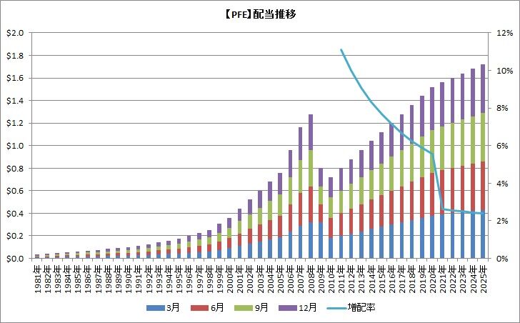 下はファイザーの配当推移です。私自身はこの増配の恩恵にはまだ預かっていませんが、今後も緩やかにでも増配が続いてくれることを願っています。