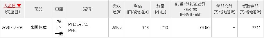 昨日、ファイザー(PFE)からの配当が入金された旨のお知らせがありました。