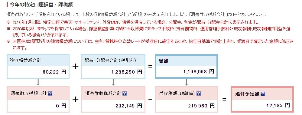 なので、この232,145円から、譲渡損益の-60,232円と配当金・分配金合計(税引き前)1,258,390円の総額である1,198,068円から算出される理論値の徴収税額219,960円を差し引いて、12,185円の還付となるようです。