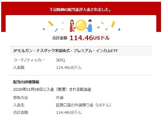 昨晩、JPモルガン・ナスダック米国株式・プレミアム・インカムETF(JEPQ)から、今年一発目の配当金(分配金)の入金がありました。