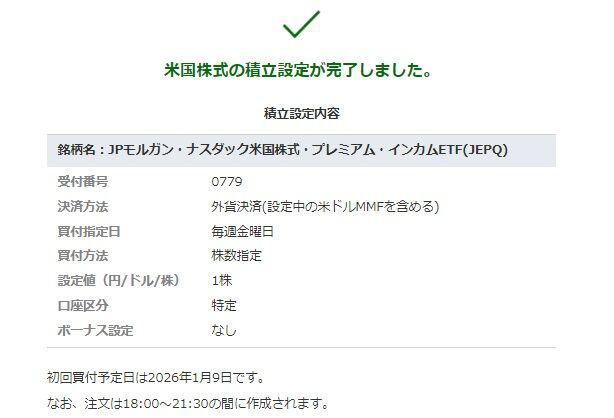 JEPQを毎週金曜日に1株ずつ特定口座で買い増すことにしました。決済方法は外貨(つまり米ドル)にです。