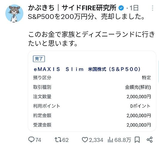 売却画面も添えられていました。売られたのはeMASIS Slim 米国株式(S&P500)でした。
