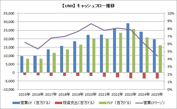 キャッシュフローは2年連続で減少。営業キャッシュフローマージンはこの2年間で半減しました。