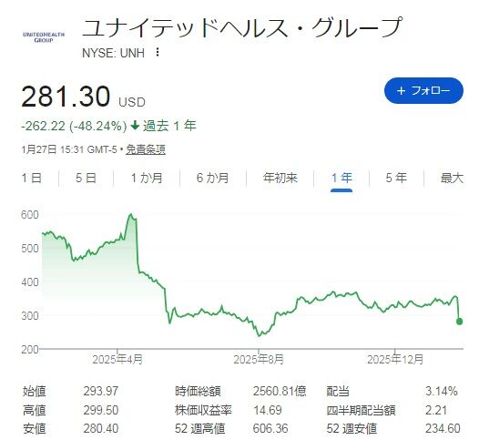 保険大手のユナイテッド・ヘルス・グループ(UNH)の株価が暴落しました、、。前日比20%安となっています。