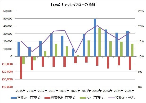 シェブロンは年間で128億ドルの配当支払を株主にしましたので、キャッシュフローベースの配当性向は77.1%まで上昇してしまいました(前年は59.9%)。