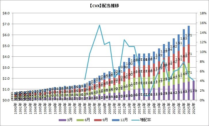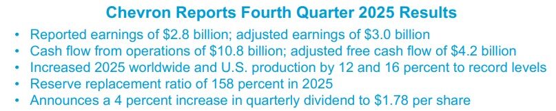 シェブロン(CVX)が2025年第4四半期の決算を発表しました。内容はあとで触れるとして、、これに加えて、、4.1%の増配も発表しました!ヾ(=^▽^=)ノ