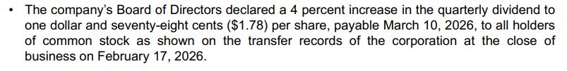 2026年3月10日を支払日とする四半期配当のは1.78ドルになります(従来は1.71ドル)。