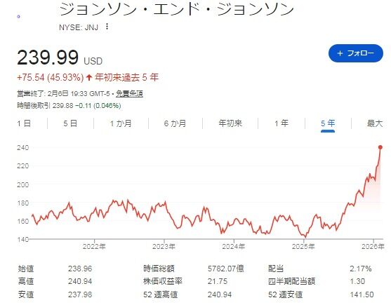 ここ数年間株価がぐずついていたJNJは、何かを突き破ったように上昇していて、連日のように過去最高値を更新しています。