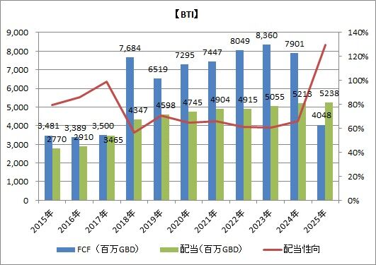 ブリティッシュ・アメリカン・タバコは年間で52.38億ポンドの配当を株主に支払いましたので、キャッシュフローベースの配当性向は129%になってしまいました。