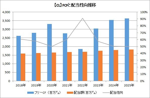 コルゲート・パルモリーブの年間配当支払額は18.23億ドルでした。フリーCFに占めるキャッシュフローベースの配当性向は50%で、安全性の問題はなさそうです。