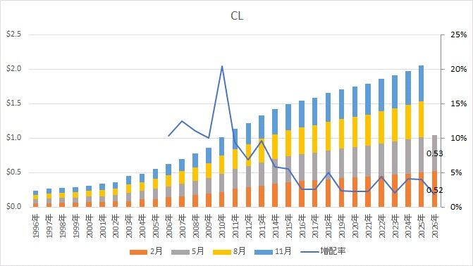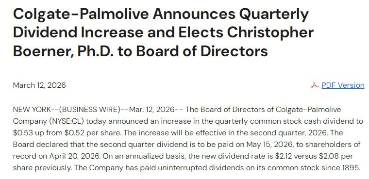 歯磨きチューブの世界的メーカーであるコルゲート・パルモリーブ(CL)が5月の四半期配当での増配を発表しました。
